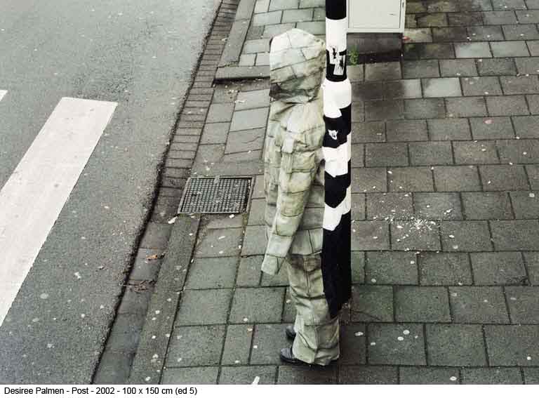 Художественный прием игры в прятки не так уж нов, просто он снова в центре внимания. Голландская художница Дезире Пальмен, как и Лью Болинь, по образованию скульптор. Еще в 90-х она решила одеваться и фотографироваться на сходном фоне. Все началось с того, что она пришла на роттердамскую почту за марками в камуфляжном костюме, которые сама собственноручно шьет и разукрашивает. Художница не желала, чтобы камеры слежения, установленные по всему городу, фиксировали ее лицо каждый раз когда ей захочется отправить друзьям открытку.